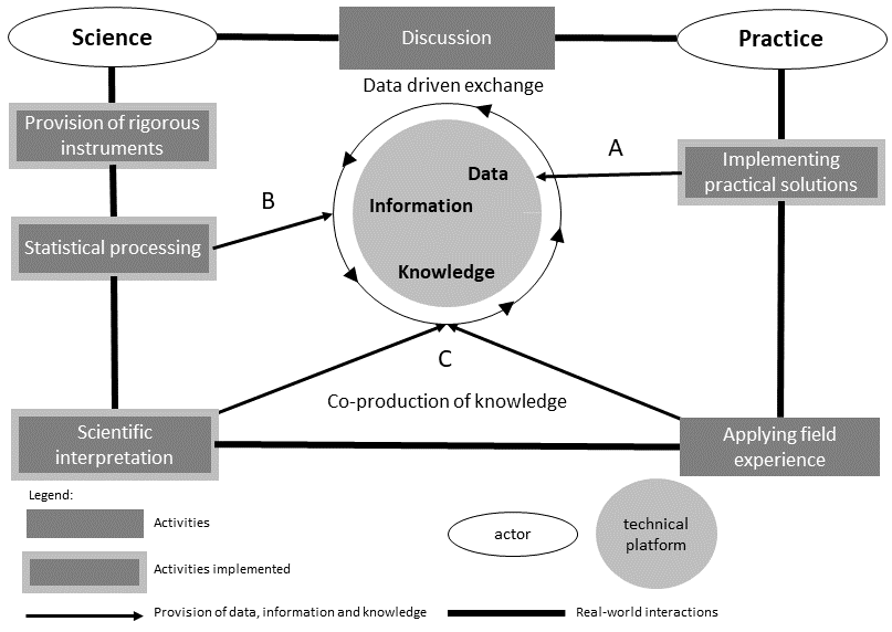 Figure 9 [Fig. 9] shows the ideal exchange cycle with its different activities of science and practice when exchanging and accumulating data, information, and knowledge [11], [12], [13], [45]. Informed by [11] it signifies a new model for a science-practice-dialogue. This ideal cycle (Figure 9 [Fig. 9]), which goes beyond typical benchmarking, inspired the development of the exchange system, which in the current version, however, only partly realizes this cycle. The data to information exchange cycle is fully implemented while the transformation to knowledge, in particular the co-production of knowledge, needs further development.