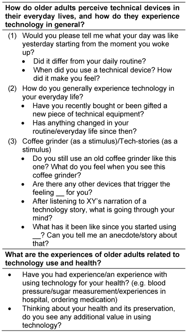 We created an interview guideline based on the research questions (see Table 1 [Tab. 1]). Also, we did a pretest with two participants to determine whether the respondents would understand the questions and to ascertain the validity of these questions. No chances had to be made. Interviews followed topical trajectories, however, we allowed the conversation to pivot away slightly from the main questions to gain deeper insights into the participants’ views. Additionally, to generate technology-associated experiences, we used conversation stimuli as an entry point, e.g., a mechanical coffee grinder brought along and/or a technology story read out loud (storytelling). The tech-stories are short narrative passages related to technology perceptions from citizen workshops (associated with the multilevel research design) conducted in 2017/2018 [8].