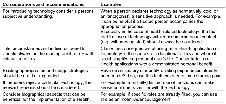 The interviewees are confronted with technology in different ways. Within the acquisition of technology, the learning prerequisites, and learning dispositions are also highly individual (e.g. ‘I think it’s great to learn digitally at the age of 87. So, I can participate in life.’ (Mrs. G: 83) vs. ‘I don’t care to learn anything else.’ (Mrs. H: 181)). The results further show that as soon as the individual benefit of technology is recognized, it will be used, or at least the willingness to come to grips with its handling increases.