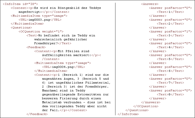 TextMarker erwartet als eigentliche Eingabe Text-Dateien, deswegen wird das Word-Dokument zunächst (durch Anbindung des Open-Source-Projects OpenOffice.org) in einfaches HTML konvertiert. Dieses und die beiden optionalen Text-Dokumente – für long-menu-Fragen und die Untersuchungsauswahl – werden an TextMarker übergeben und durch jeweils eine TextMarker-Regeldatei verarbeitet. Als Ausgabe für den Benutzer werden für jede Eingabedatei Log-Informationen und eine annotierte Version der Eingabe erstellt. Als Ausgabe für die Weiterverwendung im CaseTrain-Player erzeugt TextMarker ein XML-Falldokument (Abbildung 2 [Abb. 2]) und ggf. (aus den Inhalten der beiden optionalen Text-Dokumenten) ein XML-Terminologie-dokument.