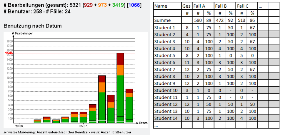 In Abbildung 5 [Abb. 5] zeigen wir für den Kurs der Infektiologie detailliertere Ergebnisse, insbesondere den zeitlichen Verlauf der Anzahl der Fallbearbeitungen (Abbildung 5 [Abb. 5], links) und deren Aufschlüsselung nach Fall und Lerner (Abbildung 5 [Abb. 5], rechts).