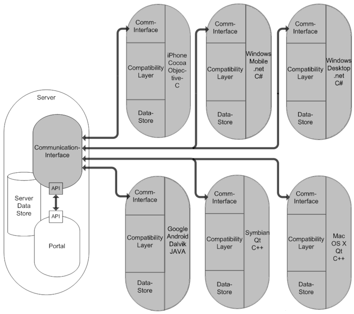 Ein User kann unterschiedliche Smartphone-Betriebssysteme in unterschiedlichen Kombinationen mit seinem Account verknüpfen. In Abbildung 1 [Abb. 1] wird beschrieben aus welchen Komponenten das Framework besteht. Die Datenrepräsentation einer Applikation kann innerhalb des Frameworks auf die unterstützten Plattformen portiert werden. Somit wird Komplexität aus der Applikation genommen und an das Framework abgegeben. Ein Design-Tool unterstützt bei der Erstellung der Datenrepräsentation und erstellt Rahmenprojekte, Stubs und Skeletons für die einzelnen Plattformen. Stubs und Skeletons sind Begrifflichkeiten aus der verteilten Anwendungsprogrammierung (RMI – Remote Method Invocation). In den Stubs und Skeletons findet das Umwandeln von Übergabeparametern in der lokalen Programmiersprache in Pakete des darunterliegenden Kommunikationsprotokolls (Marshalling) und das Zurückwandeln in einen Übergabeparameter für die entfernte Programmiersprache (Unmarshalling) statt. Die Replikationskomponenten befinden sich auf beiden Seiten, sowohl im Client-Communication-Interface (Stub) als auch im Server-Communication-Interface (Skeleton). Die Stubs und Skeletons bestehen aus einem generierten Source-Code-Teil und einer Konfigurationsdatei, die in die endgültige Applikation direkt hineinkompiliert wird. Das eben beschriebene System wird im Folgenden als (Closed-Source-)Komponente eines Gesamtsystems betrachtet, dieses System muss nach dem MPG zertifiziert werden.