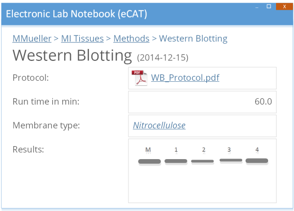Figure 2: Structure of the metadata scheme for a Western Blot experiment implemented in the ELN. This figure shows an excerpt from the metadata scheme for a Western Blot experiment which was implemented in the ELN. Firstly the detailed protocol of the experiment is attached as a pdf file; secondly all variable data which is produced during the experiment could be documented. Results in form of images could be easily attached to the protocol.