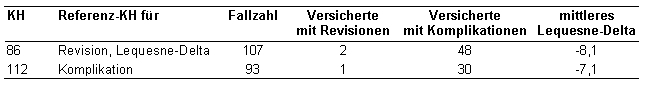 Aufgrund einer Revisionsrate, die nach Art der Stichprobendefinition bei den befragten Versicherten weniger als halb so groß ist, wie im Routinedatensatz 2000/2001, haben wir für den hier ausgewerteten Datenbestand die Mindestfallzahl unter Berücksichtigung ausschließlich der aus den Befragungsdaten ermittelten Ergebnisparameter (Komplikation und Lequesne-Delta) festgelegt.