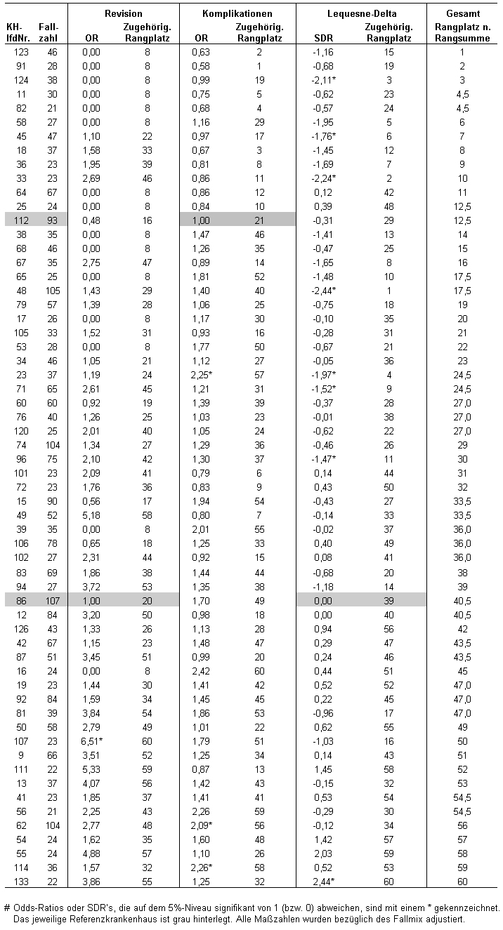 Grundsätzlich können für die Ergebnisparameter „Revision“, „Zahl der Revisionen“, „Komplikation“, „Zahl der Komplikationen“ und „Lequesne-Delta“ selbständige Ranglisten erzeugt werden. Zur Vermeidung der Überschneidungen bei den Revisionen und den Komplikationen erscheint es nach den vorliegenden Analysen jedoch angebracht, entweder die jeweilige dichotome oder die jeweilige Zählvariable zu verwenden.