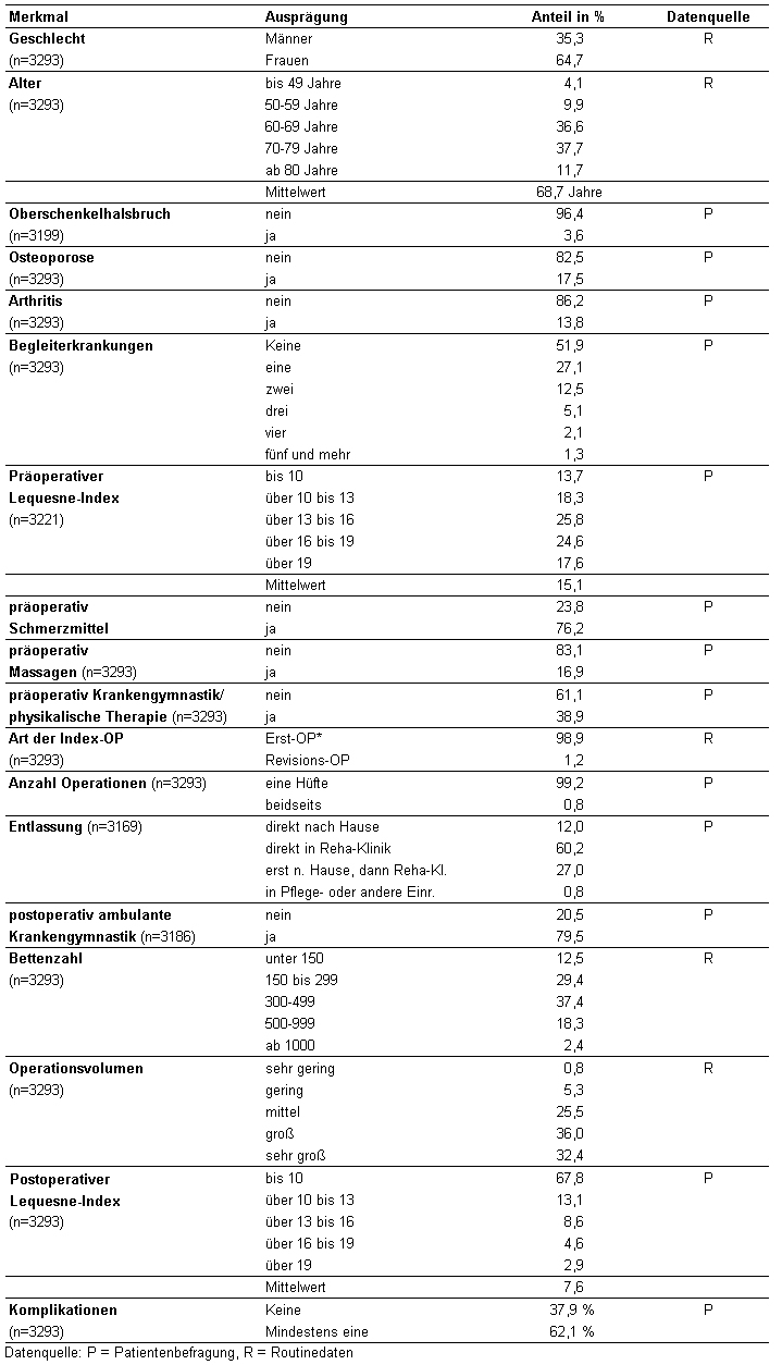 Für den hier diskutierten zweiten Studienansatz wurden neben den aus den Routinedaten ableitbaren Merkmalen Alter, Geschlecht und Art der Index-Operation (Erstimplantationen/ Revision) folgende in der Patientenbefragung erhobene anamnestische Angaben als Fallmix-Variablen verwendet: Oberschenkelhalsbruch (ja/nein), Osteoporose (ja/nein), Rheumatische Arthritis (ja/nein), Anzahl der Begleiterkrankungen, (erinnerter) präoperativer Lequesne-Index, Operationen während des Index-Aufenthaltes (einseitig/beidseitig).