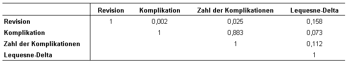 Die durchgängig niedrigen Rangkorrelationskoeffizienten der Tabelle 6 [Tab. 6] weisen nachdrücklich darauf hin, dass Revisionen, Komplikationen und der Rückgang des Beeinträchtigungsniveaus die Ergebnisqualität einer Hüftgelenksoperation auf wesentlich verschiedenen Dimensionen messen. Bezogen auf die rohen (unstandardisierten) Effekte findet sich zwischen dem Lequesne-Delta und dem dichotomen Komplikationsindikator sogar eine negative Rangkorrelation in Höhe von -0,11!