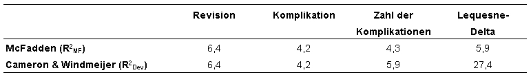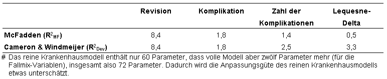 Tabelle 8: Pseudo-R2-Werte (in Prozent) nach McFadden, und nach Cameron und Windmeijer als Maße für die Modellanpassung, nur Krankenhäuser (unstandardisiert)
