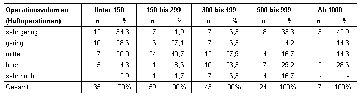 Das Operationsvolumen wurde anhand der Routinedaten der AOK-Niedersachsen abgeschätzt. Dabei wird das Operationsvolumen zwangsläufig um ca. 50% unterschätzt, da die AOK-Niedersachsen ca. 50% der GKV-Versicherten in Niedersachsen versichert. Das Ausmaß der Unterschätzung ist dabei um so höher, je geringer der prozentuale Anteil AOK-Versicherter an allen Patienten ist, die in einem Krankenhaus eine TEP-Implantation erhalten haben. Um das Ausmaß der Unterschätzung zu verringern, wurden im Merkmal für das „Operationsvolumen“ der Einrichtung neben der Prozedur „TEP-Implantation“ weitere Fallpauschalen und Sonderentgelte berücksichtigt, die im Zusammenhang mit Hüftgelenkoperationen stehen (i. E. Fallpauschalen 17.011, 17.013, 17.021, 17.023, 17.061, 17.071 17.08 oder Sonderentgelte 17.03, 17.04, 17.05, 17.06, 17.07, 17.08, 17.12 ). Um möglichst stabile Angaben zum jeweiligen Krankenhausvolumen zu erhalten, wurde darüber hinaus der Mittelwert der durchgeführten Hüftoperationen pro Krankenhaus aus den Jahren 2000, 2001 und 2002 gebildet. Die Krankenhäuser wurden entsprechend des so ermittelten Operationsvolumens in fünf etwa gleich große Gruppen eingeteilt: „sehr niedrig“ (maximal 10 Hüftoperationen pro Jahr an AOK-Patienten), „niedrig“ (11-25 Hüftoperationen pro Jahr an AOK-Patienten), „mittel“ (26-60 Hüftoperationen pro Jahr an AOK-Patienten), „hoch“ (51-100 Hüftoperationen pro Jahr an AOK-Patienten) und „sehr hoch“ (mehr als 100 Hüftoperationen pro Jahr an AOK-Patienten).