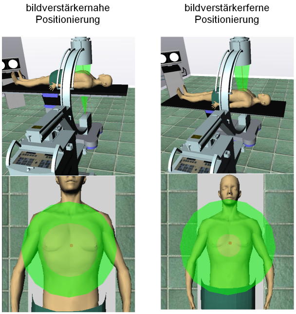 Zur Verbesserung der Strahlenschutzausbildung wurde das virtX-Programm um Komponenten zur Visualisierung von Strahlengang und Streustrahlung erweitert. Der sich von der Röntgenquelle eines C-Bogens zur Bildverstärkereinheit konisch auffächernde Bereich, in welchem die Nutzstrahlung des Röntgengerätes vorzufinden ist, wurde in virtX mittels eines halbtransparenten grünen Kegels (s. Abbildung 1 [Abb. 1]) visualisiert. Mit Hilfe dieses Kegels, welcher alle Bewegungen des C-Bogens nachvollzieht, ist es möglich die Veränderung der Strahlendosis durch die Veränderung der Durchstrahlungsfläche bei gleich bleibender Strahlenenergie interaktiv nachzuvollziehen (s. Abbildung 1 [Abb. 1]). So sieht man auf der linken Seite der Abbildung 1 [Abb. 1], dass bei der bildverstärkernahen Positionierung des durchstrahlten Volumens die Durchstrahlungsfläche größer ist als bei der bildverstärkerfernen Positionierung, woraus sich ergibt, dass die Strahlendosis für das entsprechend durchstrahlte Volumen bei der linken Positionierungsvariante geringer ist als bei der rechten. Diese Visualisierung des Strahlenganges ist während der Durchführung einer Aufgabe jederzeit ein- und ausblendbar.