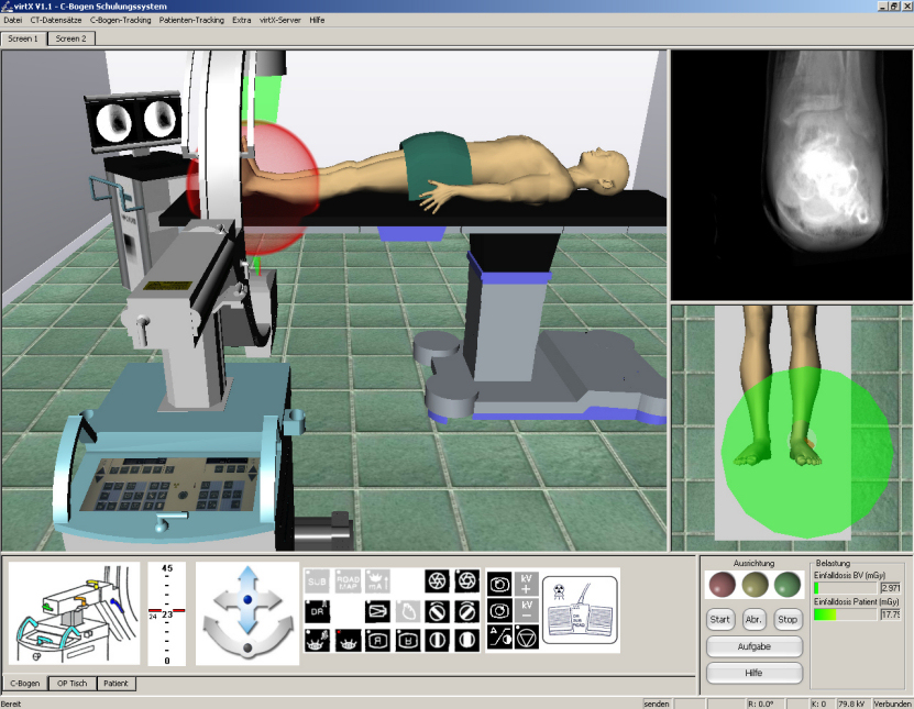 Des Weiteren berechnet die erweiterte Version von virtX die während der Aufgabendurchführung erzeugte virtuelle Einfalldosis sowohl für den Patienten als auch für den Bereich des Bildverstärkers und stellt diese Werte jeweils in Kombination mit einer farbigen Fortschrittsanzeige dar. Zur Berechnung dieser Werte werden ebenfalls Parameter, wie Positionierung des C-Bogens zum durchstrahlten Volumen, Stellung der Blenden und die Röhrenspannung, herangezogen.