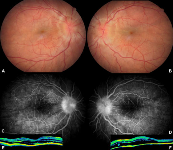A 30-year-old woman had been diagnosed to have VKH syndrome at another eye center two years prior and had been treated successfully with high-dose systemic steroids and then with oral mycophenolate mofetil (MMF) without any recurrence. She was referred to us due to the development of nearly simultaneous bilateral CNV while she was still on a daily maintenance dose of oral 500 mg MMF. Her color fundus photographs, fluorescein angiogram (FA), and optical coherence tomographic (OCT) examination at the initial diagnosis of VKH syndrome were obtained (Figure 1 [Fig. 1]). Upon our examination, her visual acuity was 20/25 in the right eye (OD) and 20/60 in the left eye (OS). No signs of anterior chamber inflammation were present in both eyes (OU); however, trace residual cells were present in OD. Intraocular pressure was 16 mmHg OU. Grayish looking juxtafoveal and subfoveal lesions in the OD and OS respectively were noted (Figure 2A and B [Fig. 2]). FA and OCT revealed bilateral type 2 CNV (Figure 2C, D, E, and F [Fig. 2]) without any other findings indicative of active inflammation. Initial treatment of OS was with intravitreal aflibercept. At the 1-week follow-up, visual acuity was 20/30 in OD and 20/40 in OS. Control OCT revealed that the juxtafoveal CNV was enlarged significantly with some intraretinal fluid in OD (Figure 2G [Fig. 2]) whereas the subretinal fluid in OS was mostly resolved (Figure 2H [Fig. 2]). Intravitreal aflibercept was then administered immediately to the right eye. Due to regulations for reimbursement in Turkey, all patients undergoing aflibercept or ranibizumab injections should receive three successive anti-VEGF injections four weeks apart. The patient’s OS received an additional injection eight weeks after the first three bilateral mandatory injections, due to evidence of minimal amount of intraretinal fluid, and the patient was followed up bi-monthly. Overall, OD received a total of three and OS a total of four aflibercept injections in a time frame of eight months, while the systemic treatment was continued. At the final visit, the patient’s visual acuity was 20/30 in OD and 20/25 in OS. Both macular lesions were determined stable upon clinical and OCT examinations, and no further injections were administered (Figure 3A, B, C and D [Fig. 3]). Moreover, OCT angiography pictures were obtained (Figure 3E and F [Fig. 3]).