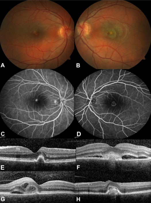 Figure 2: During the initial diagnosis of choroidal neovascularization (CNV), color fundus photographs of the right (A) and left (B) posterior pole show the foveal lesions, venous phase of angiogram demonstrates foveal hyperfluorescence, (C) right and (D) left eyes; optical coherence tomographic section depicts juxtafoveal (E, right eye) and subfoveal (F, left eye) CNV. A week following the left aflibercept injection, subretinal fluid greatly subsided in OS (H, left eye), but the subretinal and intraretinal fluid increased in OD just prior to aflibercept injection (G, right eye).