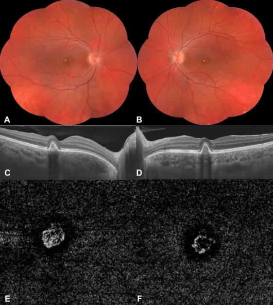 Figure 3: Eight months after the diagnosis of choroidal neovascularization (CNV), color fundus photographs of the right (A) and left (B) eyes show stable-looking foveas with relatively reduced CNV. Optical coherence tomographic section shows stable CNV without intraretinal and subretinal fluid, (C) right and (D) left eyes. Optical coherence tomographic angiogram (3×3, outer retinal slab) delineates the residual CNV, (E) right eye and (F) left eye.