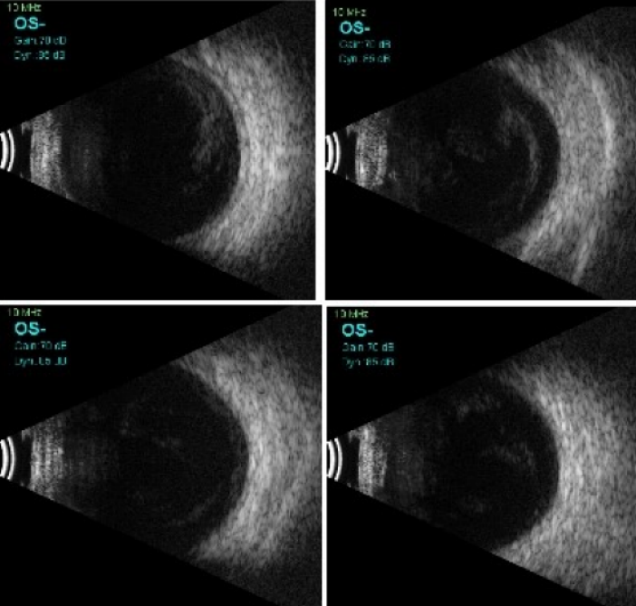 Figure 1: Transverse B-scan of all quadrants showing medium reflective dot and clump echoes in all quadrants in vitreous cavity