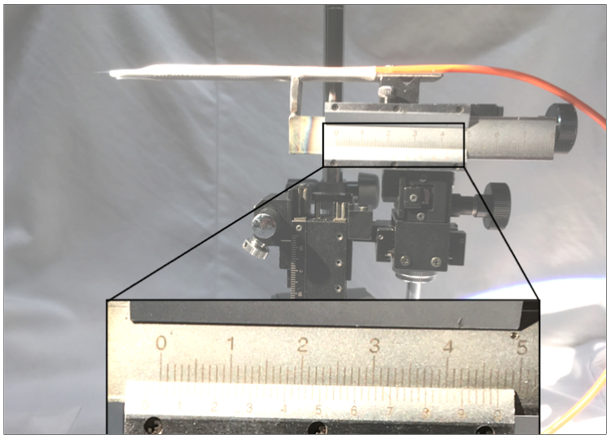 Firstly, a retroauricular-transossary incision was made. Using microsurgical techniques, access to the tympanic membrane, round window, and otic capsule was achieved. A laser fiber measuring 365 µm in diameter was positioned into the ear using a micromanipulator and a custom-made device (Figure 1 [Fig. 1]). This system allowed the irradiation of the three anatomical structures (umbo/tympanic membrane, round window, otic capsule) at distances between 0.1 and 10.1 mm.
