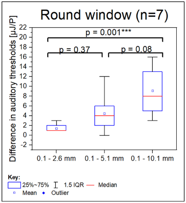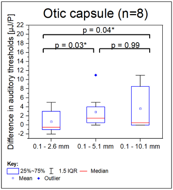 The recorded data as described in section 2.5 is displayed in box plots to allow for better clarity and comparison. Irradiation of the umbo/tympanic membrane at different distances (Figure 6 [Fig. 6]) demonstrated an increase in the auditory threshold with increasing distance from the laser source to target. The auditory thresholds at 0.1–2.6 mm and 0.1–5.1 mm (p=0.03*) as well as 0.1–2.6 mm and 0.1–10.1 mm (p=0.001***) were statistically significantly different. The difference between 0.1–5.1 mm and 0.1–10.1 mm presented a slight increase in median and mean, however the differences were not statistically significant (p=0.54). It is important to note that an outlier was identified in the 0.1–5.1 mm measurements. In this particular experiment there is no consistent explanation for the outlier, however due to the small sample numbers (n=9), this outlier could have skewed the results. These experiments will be repeated once the final wavelength for the prototype has been decided.