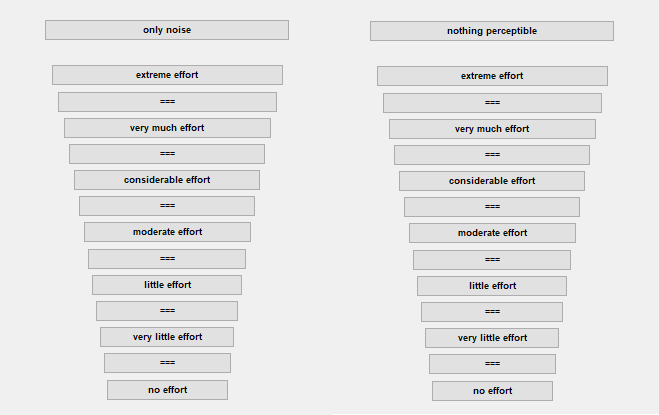 Figure 1: Scales to evaluate the subjective listening effort Left: Scale for the acoustic condition, right: Scale for the audiovisual condition; the category “only noise” was renamed “nothing perceptible”.