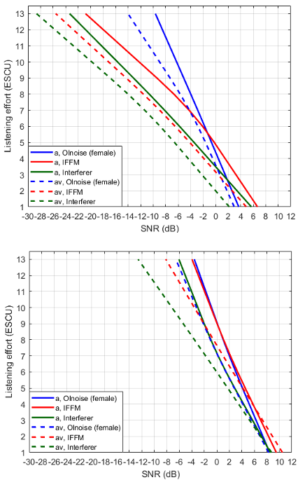 In the audiovisual (av) condition, a different rating of the maskers could be seen among normal-hearing participants (see Figure 3 [Fig. 3], above). Overall, the lowest SNR values were achieved by the interferer, so that it was perceived as the least effortful, while the Olnoise was perceived as the most effortful, due to having the highest SNR values. The differences between the maskers increased with increasing listening effort. Between Olnoise and interferer, the difference in SNR at 13 ESCU was about 14 dB. For the IFFM, SNR values that were on average 2.5 dB higher than those of the interfering speaker were required.