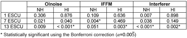 Among the hearing-impaired participants also, the interferer tended to be rated as least effortful (see Figure 3 [Fig. 3], below). In the comparison between IFFM and interferer, the difference up to 7 ESCU was approx. 2 dB, and up to 13 ESCU the difference increased to about 4 dB. No clear difference was visible between Olnoise and IFFM. The ANOVA showed that the ratings of the maskers [F(2.16)=6.393, p=0.009] and the categories [F(6.48)=123.614, p<0.001] differed significantly. Furthermore, a significant interaction between category and masker was found [F(12.96)=8.640, p<0.001]. Post-hoc t-tests with a Bonferroni-corrected significance level showed that the SNR values of the interferer and Olnoise at 13 ESCU (p=0.002) and the interferer and IFFM at 7 ESCU (p=0.004) differed significantly.