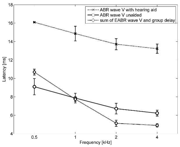 Abbildung 1: ABR-Welle-V-Latenzkennlinien bei unversorgtem Ohr (ABR wave V unaided), bei Versorgung mit dem CI-System MED-EL MAESTRO (sum of EABR wave V and group delay) und bei Versorgung mit dem Hörgerät Phonak Una M (ABR wave V with hearing aid) (entnommen aus [11]). Bei der CI-Latenzkennlinie sind sowohl die EABR-Welle-V-Latenzen, als auch die frequenzspezifischen Prozessierungszeiten im CI-System zwischen Mikrofon und Elektrode abgedeckt.