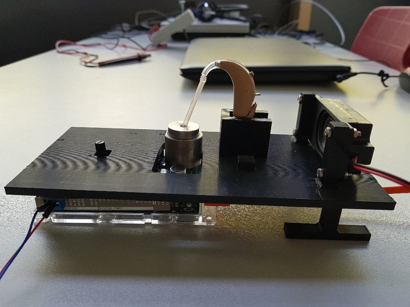 Der Messaufbau besteht aus einem Messtisch, auf welchem das Testmikrofon mit 2-ccm-Kuppler, das Referenzmikrofon sowie ein Lautsprecher zur Stimuluswiedergabe verbaut sind. Beim Test- und Referenzmikrofon handelt es sich um identische Elektretmikrofone, die in jeweils gleichem Abstand zum Lautsprecher montiert sind. Das Hörgerät kann über einen Sockel an einer definierten Stelle platziert werden. Unter dem Messtisch befindet sich die verwendete Elektronik, bestehend aus einem Arduino DUE Mikrocontroller und einem dafür angefertigten Shield (Platine, die auf das Arduino-Board aufgesteckt werden kann). Der Zeitaufwand für die Fertigung des Messaufbaus betrug ohne 3D-Druck in etwa 10 Arbeitsstunden. Der fertige Messaufbau ist in Abbildung 2 [Abb. 2] dargestellt. Im Folgenden werden diese Komponenten detailliert beschrieben.