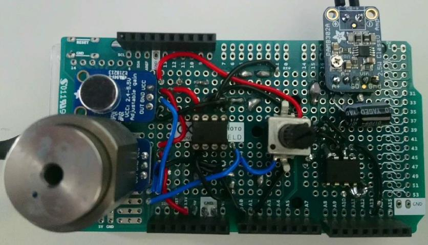Die Aufnahme von Test- und Referenzsignal erfolgt über zwei Elektretmikrofone. Die Mikrofonsignale wurden in ihrer Verstärkung so angepasst, dass sowohl das Referenzsignal als auch das Testsignal, welches durch das HG zusätzlich verstärkt wird, im Arbeitsbereich des 12-Bit A/D-Wandlers des µC zwischen 0 und 3,3 V liegen.