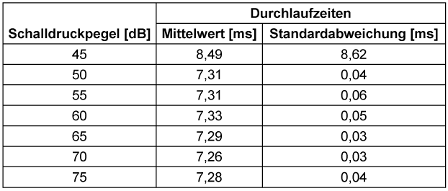 Tabelle 2: Mittelwerte und Standardabweichungen der vermessenen Durchlaufzeiten bei verschiedenen Pegeln für das Phonak Una M