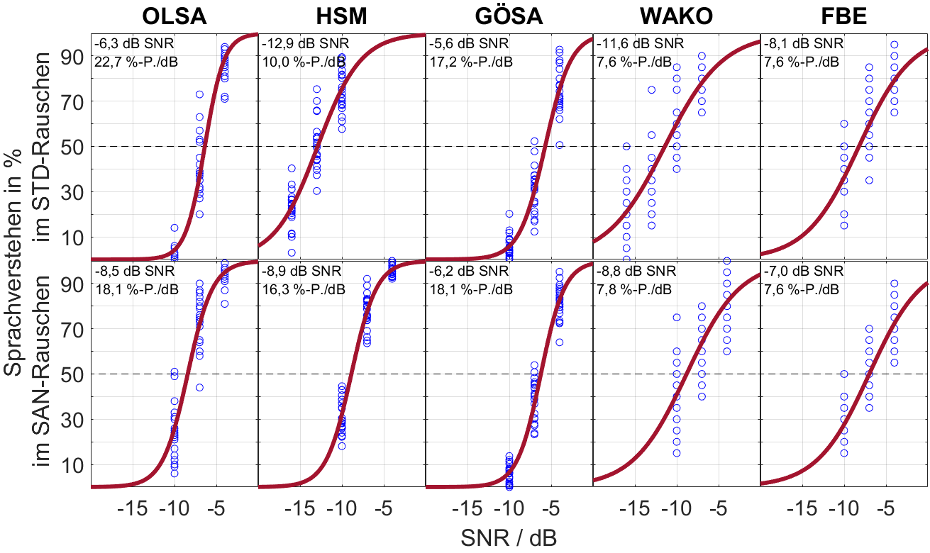 Abbildung 3: Sprachverstehen in % (blaue Kreise) für alle Probanden und alle Sprachtests im Standard-Rauschen (STD, oben) und im selbstgenerierten sprachsimulierenden Rauschen (SAN-Rauschen, unten); an die Messergebnisse wurden Diskriminationsfunktionen angepasst (rot). Die Zahlen in den Graphiken geben den SRT50 in dB SNR und die Steigung s50 in%-Punkte/dB an.