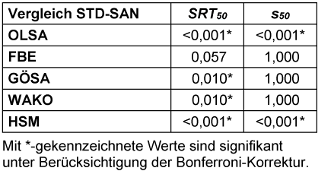 Beim Vergleich der SRT50-Werte zwischen STD- und SAN-Rauschen ergab der t-Test für OLSA, HSM, GÖSA und WAKO jeweils einen signifikanten Unterschied (Tabelle 5 [Tab. 5]). Der entsprechende Vergleich für den FBE zeigt keinen signifikanten Unterschied. Der t-Test zum Vergleich der s50 im STD- und SAN-Rauschen ergab nur für OLSA und HSM signifikante Unterschiede (siehe Tabelle 5 [Tab. 5]).