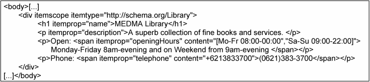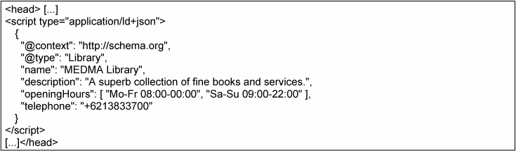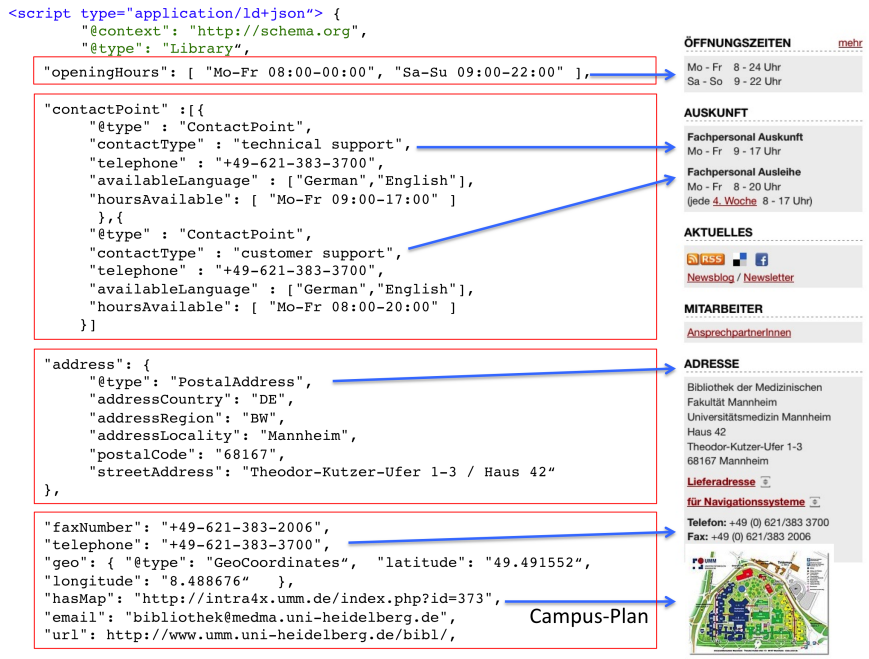 Abbildung 3: Modellierung der Eckdaten der Bibliothek der Medizinischen Fakultät Mannheim. (Anmerkung: Das Attribut ‚hoursAvailable’ wurde so modelliert, dass das Test-Tool für strukturierte Daten [24] dieses ohne Fehler akzeptiert, obschon Schema.org den Wertebereich hierfür anders definiert. Siehe hierzu auch den Abschnitt Ergebnis.)