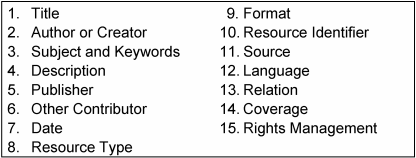 Tabelle 1: Diese 15 Elemente wurden 1998 offiziell als Dublin Core Metadata Element Set, Version 1.0 [30] veröffentlicht