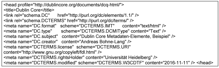 Die 1995 in der Planung [6] vorliegende Version 3.0 von HTML wurde 1996 als W3C-Empfehlung herausgegeben und im gleichen Jahr wurden auch Überlegungen zu der Einbettung von Metadaten in HTML angestellt [7] (siehe Tabelle 1 [Tab. 1]). Im Jahr 1997 wurde die HTML-Version 3 durch die Version 4.0 ersetzt, welche 1999 die Einbindung von Dublin-Core-Elementen in die technischen Spezifikationen der Requests For Comments (RFC) mit ‚Encoding Dublin Core Metadata in HTML‘ festlegte [7], [8]. Ab 2010 war die Einbindung von Metadaten keine RFC-Empfehlung mehr, sondern wanderte in die Obhut der Dublin Core Metadata Initiative DCMI (http://dublincore.org/). In Tabelle 2 [Tab. 2] wird gezeigt, wie aktuelle Dublin-Core-Metadaten in Webseiten mittels HTML in der Version 5 zu integrieren sind.