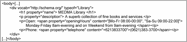 The semantic web has been developing for the last 10 years and with its Resource Description Framework (RDF) and vocabularies it seems to be usable today. Unfortunately RDF is a quite complex technique that comes with loads of standards and high IT know-how and is at least not designed for simple use in libraries or for normal web site operators. In contrast to this large-scale and complex solution the great and leading companies for search engine sites like Google, Microsoft, Yahoo und Yandex formed an alliance and defined ‘structured data’ to describe semantic infomation for web pages. Basing on the structured data definition ‘Library’ (https://schema.org/Library), the Library of the Medical Faculty Mannheim defines some of its basic data as machine-readable structured data on its web site. Furthermore, the website’s starting page contains semantic metadata in Open Graph format (that Facebook crawls and analyses) and Dublin Core format.