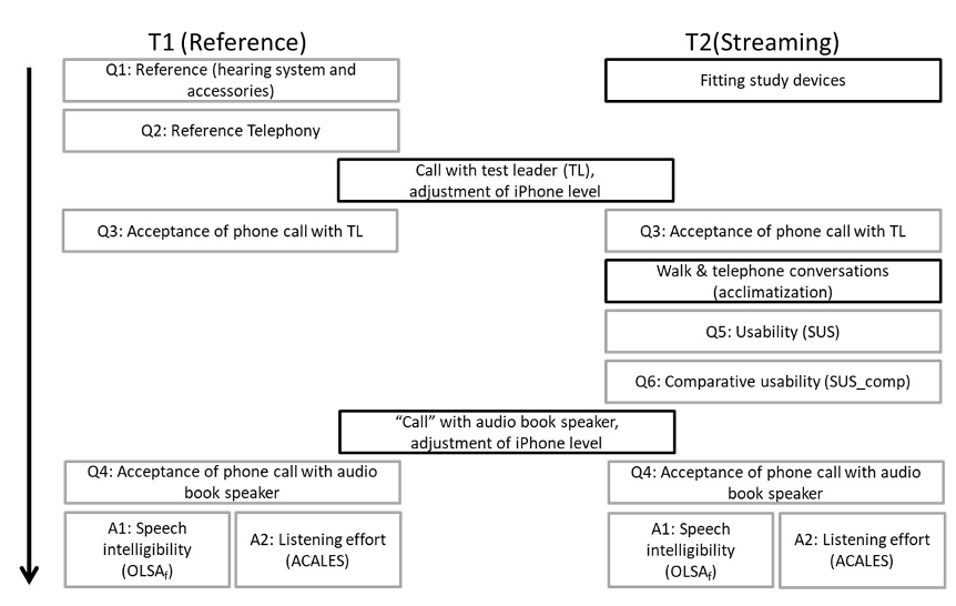 The test protocol can be seen in Figure 1 [Fig. 1]. The study was organized in two appointments (T1 and T2). Apart from a provided test smartphone (Apple iPhone 7), on the first appointment (T1, reference), phone use was only investigated with the equipment that the participants normally use in everyday life. Although the hearing instruments can in principle also be used with Android smartphones, only one system was used here to better control the influence of the smartphone on the measurements. The participants filled out questionnaires about their hearing systems and the corresponding accessories (Q1) as well as about reference telephony (Q2, see also Figure 1 [Fig. 1]). Based on this survey of the participants' current telephony status, the reference was determined individually. On the second examination date (T2, streaming), the participants were tested with the study hearing systems, GN ReSound LiNX 3D LT962-DRW or LT988-DW and Cochlear N7 processor. For this purpose, the study devices were first fitted individually. The participants then paired their devices with the test smartphone, which was then used to make phone calls.